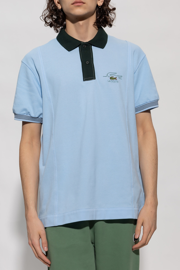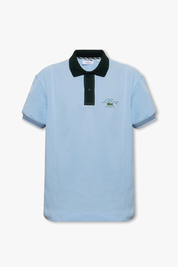 Blue polo shirt from Lacoste. Made of organic cotton, this short sleeve design features buttons, a logo patch and ribbed trims at the collar and cuffs.