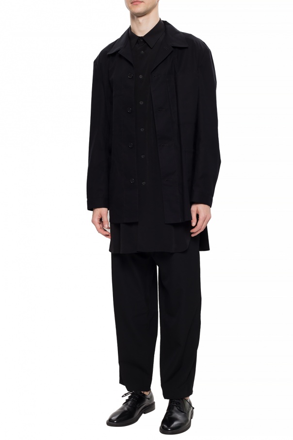 Black loose-fitting trousers from Yohji Yamamoto. Made of wool. Drawstring waist. Two slip pockets on the front, two button pockets at the back. Tapered 7/8 length legs.
