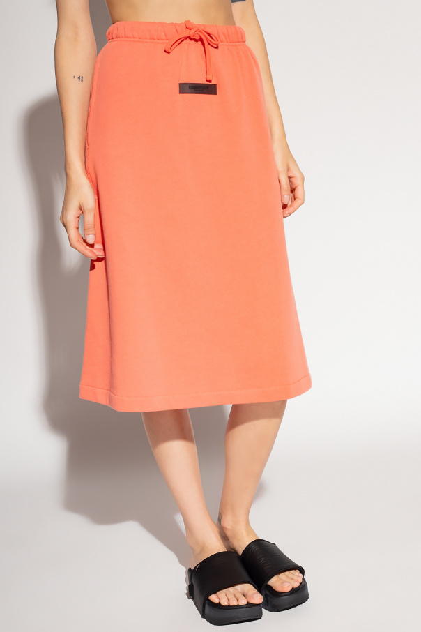 Pinkish orange skirt from Fear Of God Essentials. Made of cotton, this design features an elastic drawstring waistband, the brand’s signature rubber logo patch in black and two slip pockets.