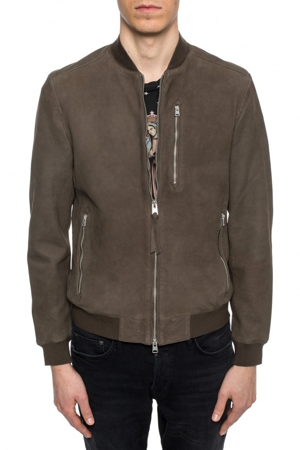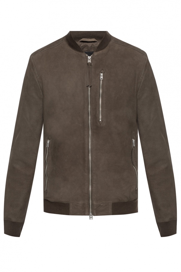Green and brown ‘Stones’ jacket from AllSaints. Made of sheepskin. Zip fastening. 3 zip pockets on the front. Ribbed bottom hem and cuffs.