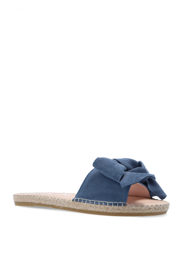 Blue ‘Hamptons’ slides from Manebi. Made of suede, this model features a distinctive tie closure and a natural jute sole with a thin rubber layer in beige.