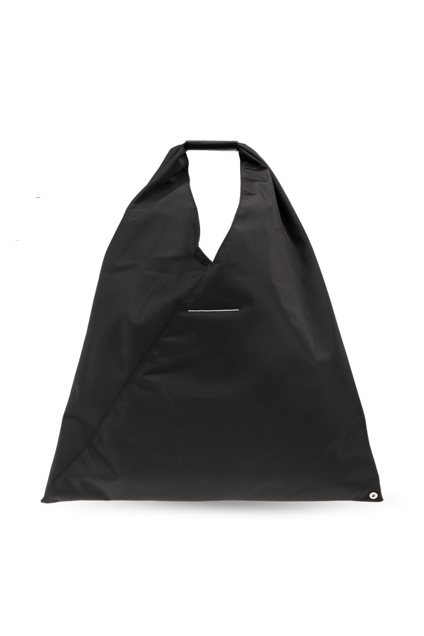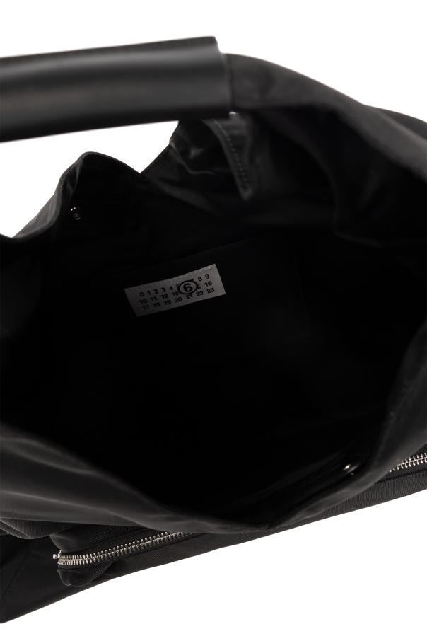 Black shopper bag from MM6 Maison Margiela. This model features a black logo print, zipped front pocket, half-round handle and one internal compartment with one slip pocket.