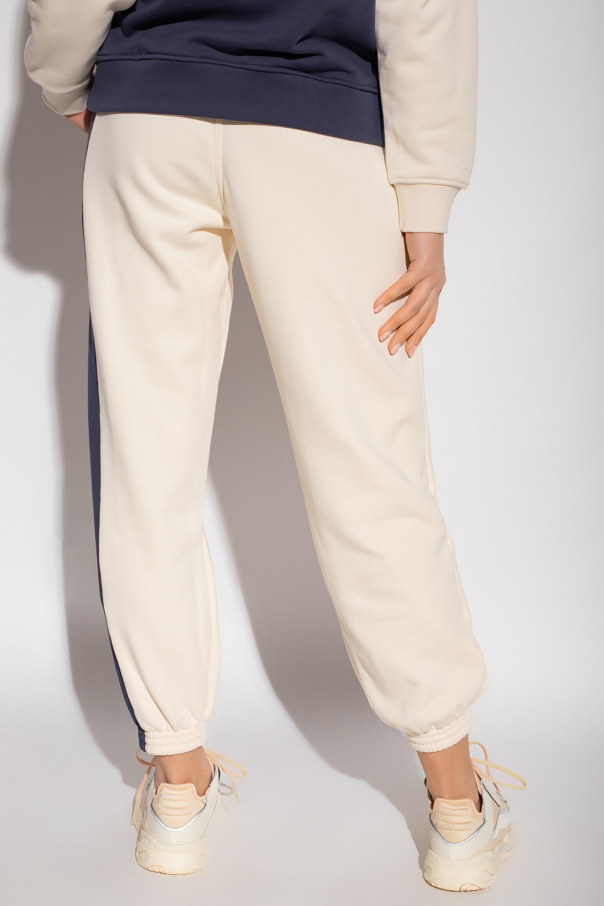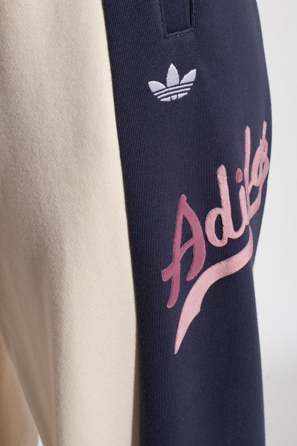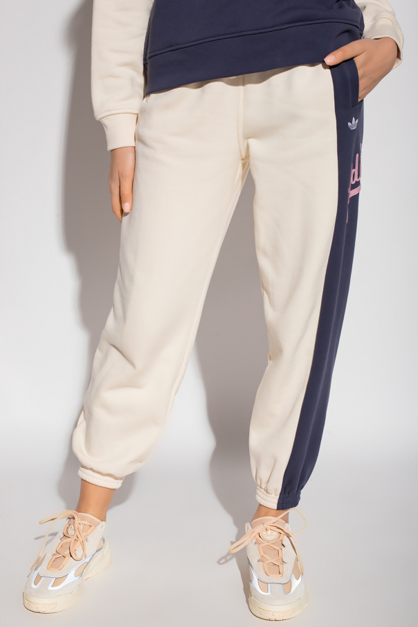 Cream and navy blue sweatpants from ADIDAS Originals. Crafted from cotton, this pair features a drawstring waist, side pockets, elasticated cuffs, white logo embroidery and a purple velvet-flocked logo appliqué.