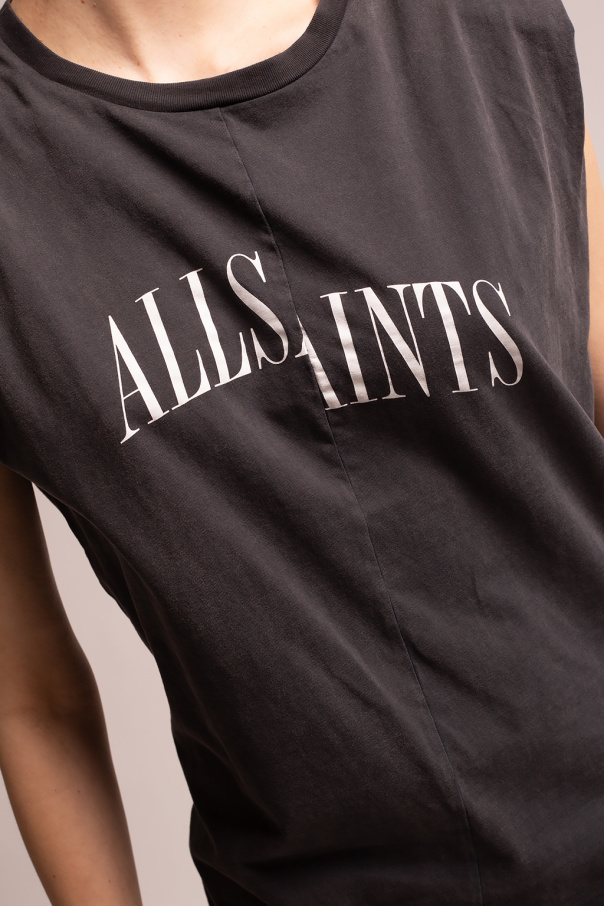 Black ‘Coni’ sleeveless top from AllSaints. Crafted from cotton, this garment features a round neck, white logo and padded shoulders.