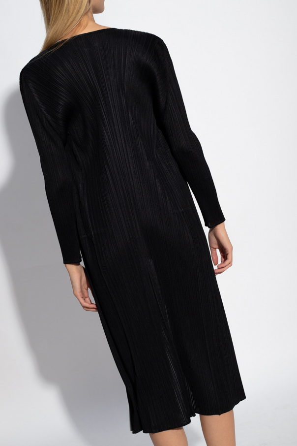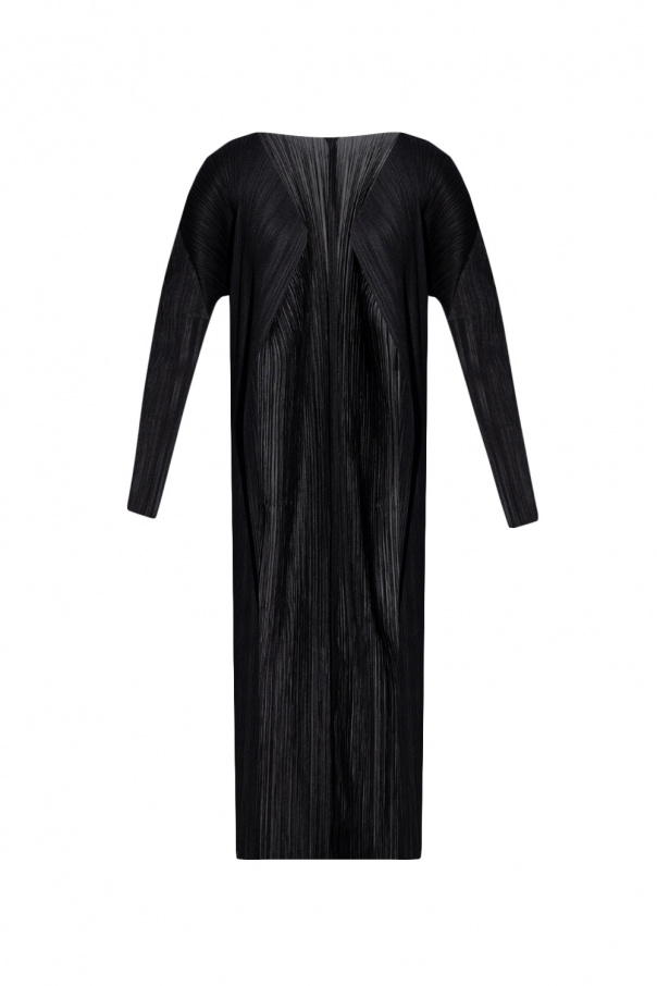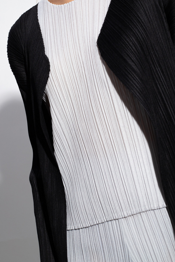 Black cardigan from Issey Miyake Pleats Please. Distinguished by the brand's signature pleating technique, this style features two slip pockets and three-quarter sleeves.