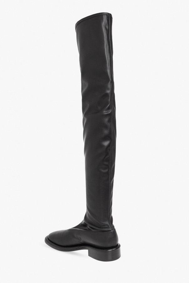 Black boots from Proenza Schouler. Crafted from vegan leather with an over-the-knee silhouette, this model sits on a brown leather sole.