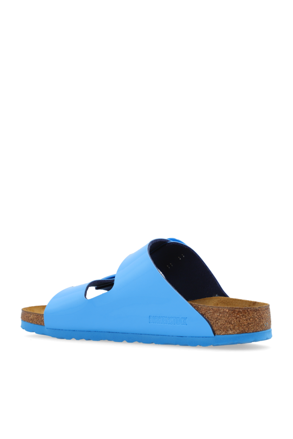 Blue ‘Arizona Big Buckle’ slides from Birkenstock. Made of patent Birko-Flor®, this pair features adjustable buckle straps, an embossed logo to the side, anatomically shaped cork-latex footbed and blue EVA foam sole.
