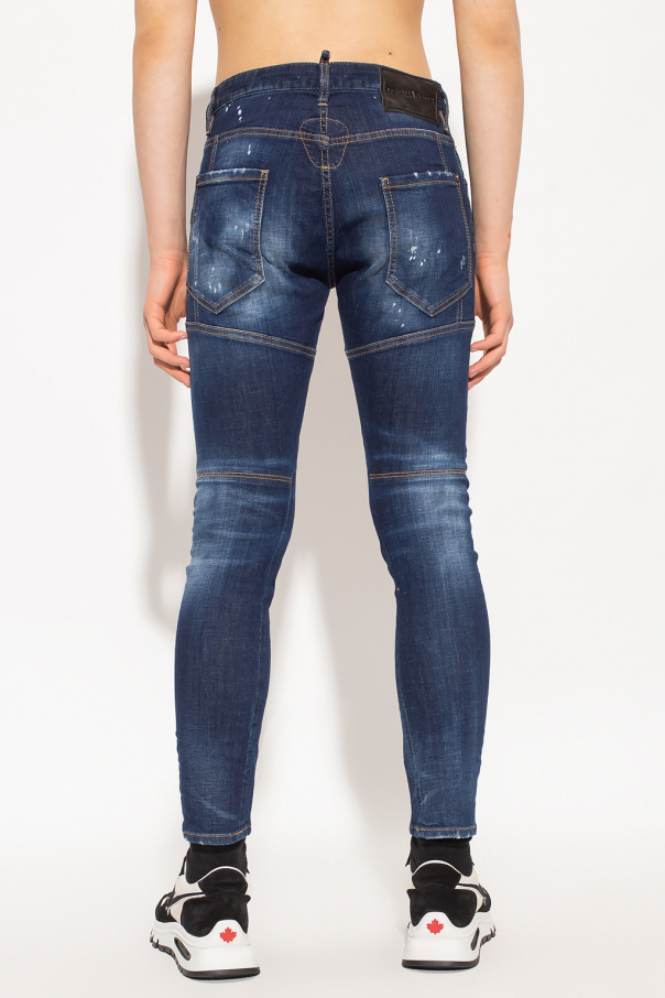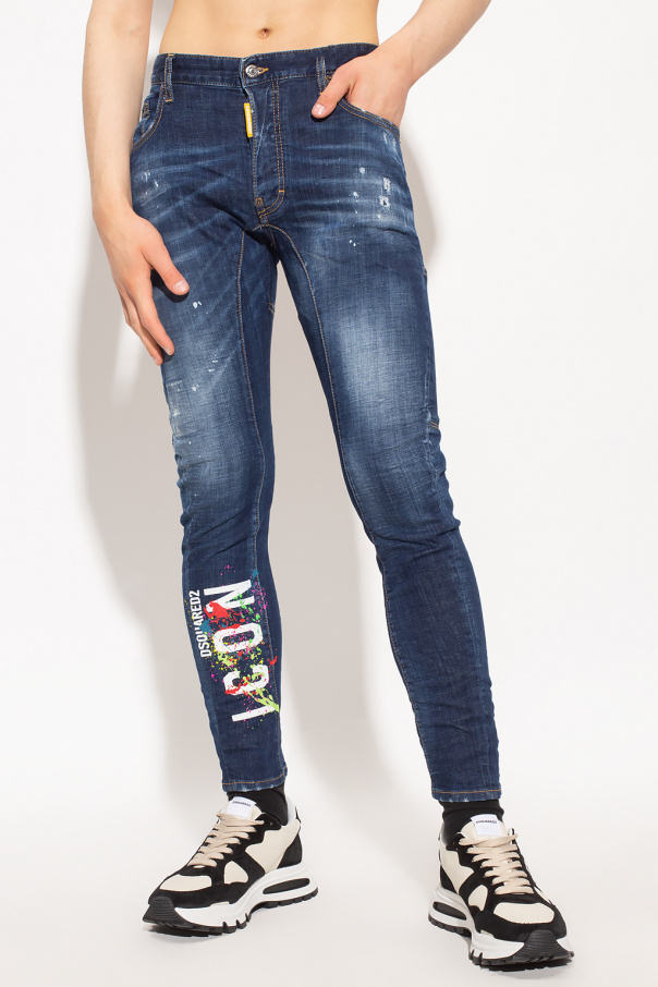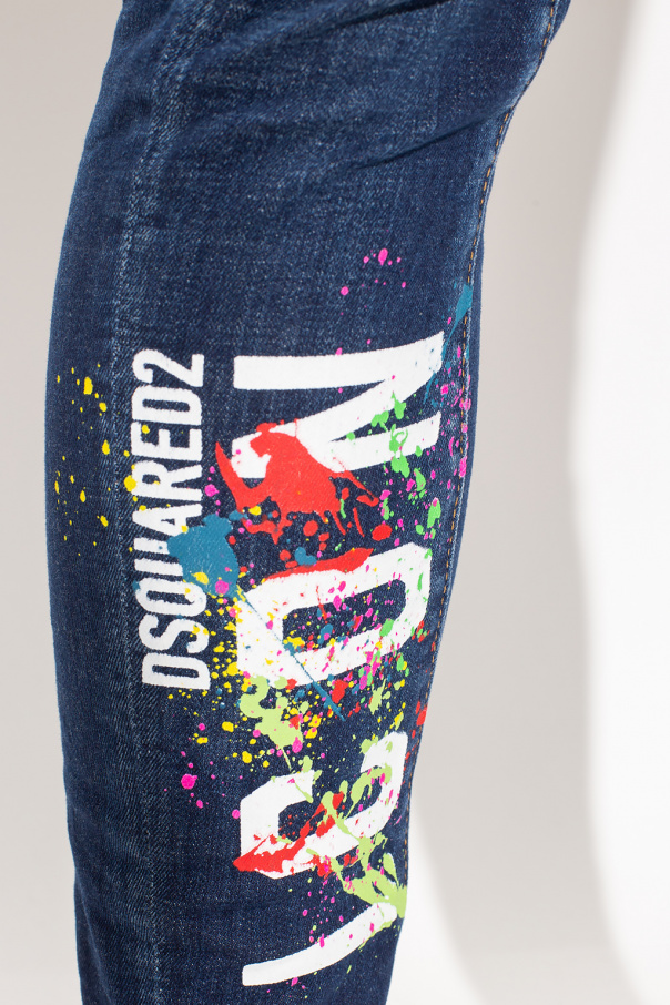 Blue ‘Tidy Biker’ jeans from Dsquared2. Embellished with colourful paint splatter effects, this pair features button fastenings, exposed stitching details and a black leather patch with an embossed logo at the back.