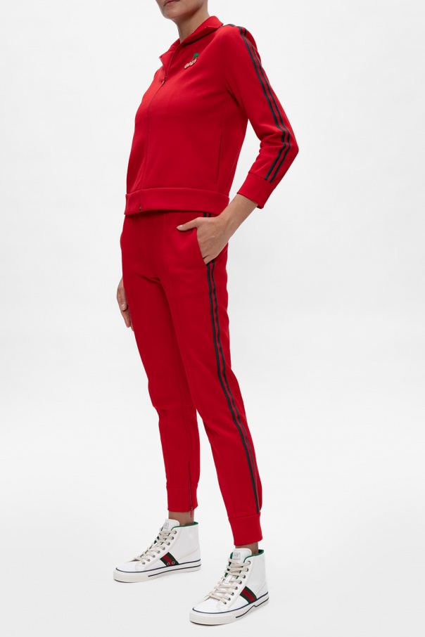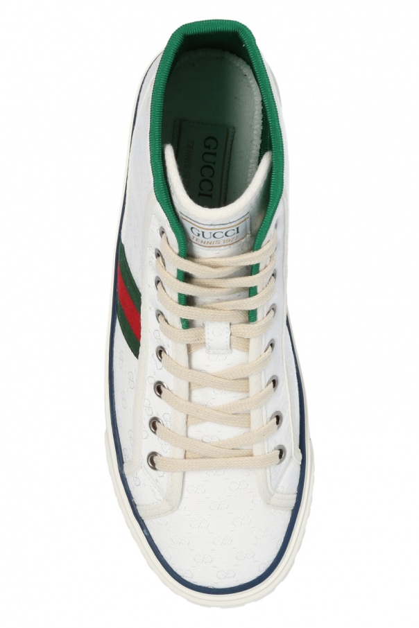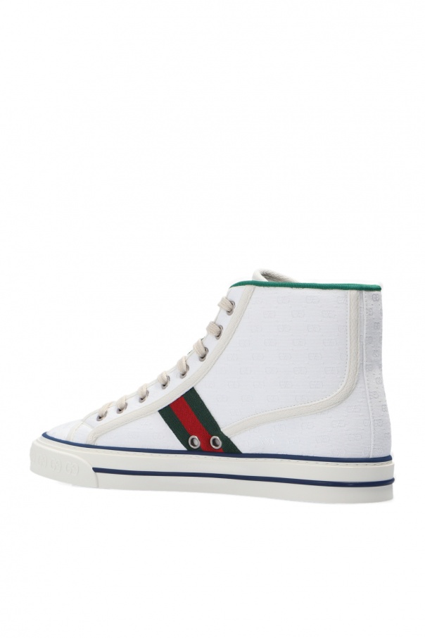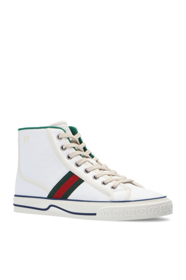 White ‘Tennis 1977’ high-top sneakers from Gucci. Showcasing the label's iconic green-red-green Web stripe and GG pattern woven into the upper, this lace-up pair is set on a white and brown rubber sole.