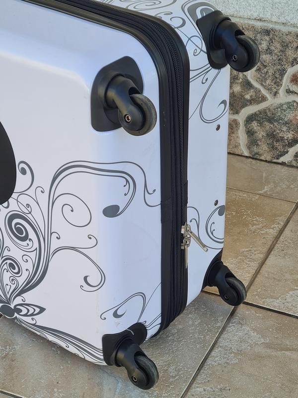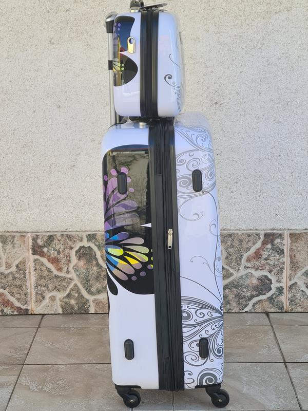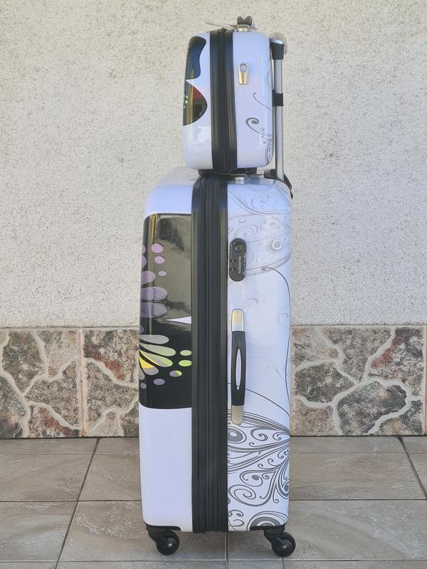 Валізу з полікарбонату Madisson 16820 белый France 🇫🇷 Упакований в плівку, яка перед користуванням знімається, чотири колеса, що обертаються навколо осі на 360 градусів, висувна ручка фіксується в двох положеннях, максимальна довжина висувний ручки 32 см, кодовий замок, прикріплений до бічної стінки валізи, дві ручки ― зверху і збоку, мають м'яку нижню частину, в середині, два відділення, розділені тканиною на блискавці, на розділяє тканини ― кишеня на блискавці, підкладка валізи ― красива, якісна, прогумовані ремені для фіксації одягу валізу
