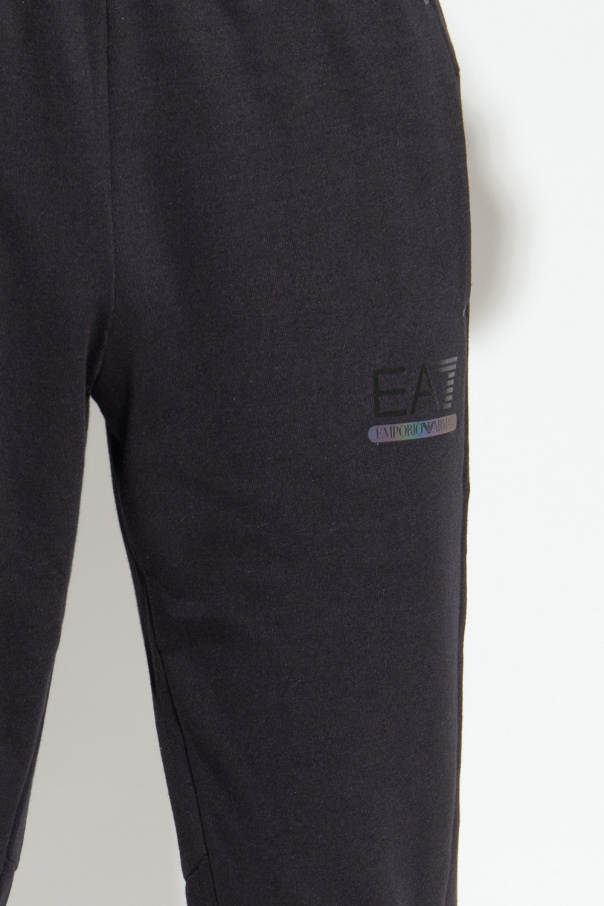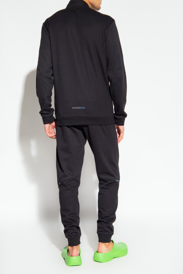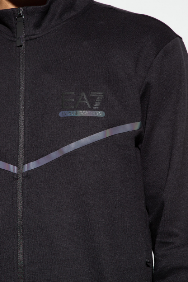 Black sweatshirt and sweatpants set with multicolored reflective elements and logo details from EA7 Emporio Armani. Made of elastic NATURAL VENTUS7 technical fabric, which helps to maintain the correct body temperature and breathability when working out. The sweatshirt fastens with a zip and is complete with two zip pockets and ribbed hem and cuffs. The sweatpants feature an elastic drawstring waistband, two front pockets and tapered legs with ribbed cuffs.