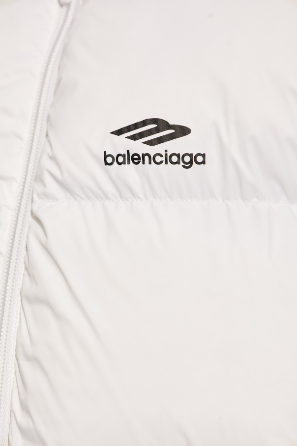 White down jacket from Balenciaga, the ‘Skiwear’ collection. Fastened with a zip, this design features a black logo, stand collar, two zip pockets, drawstring hem and waist as well as long sleeves.