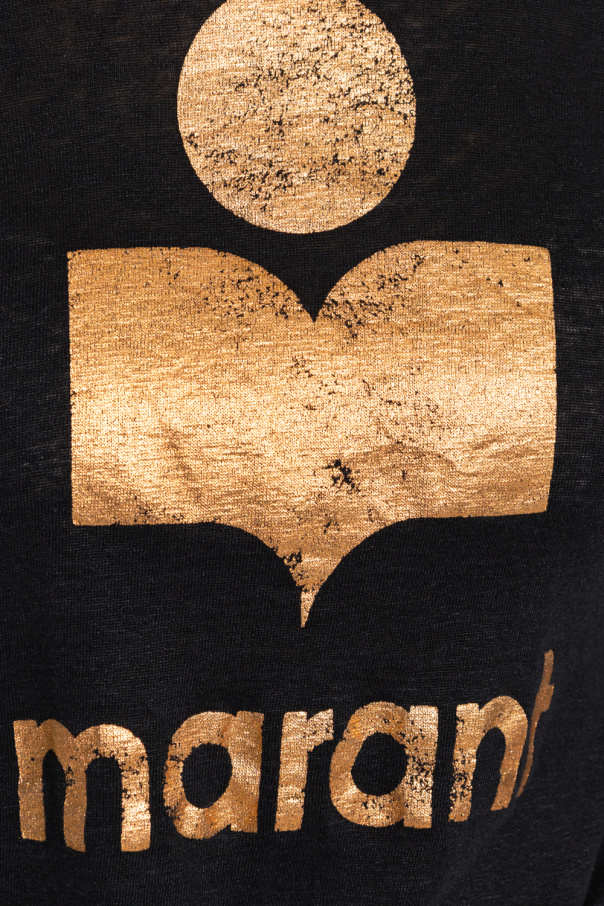 Black ‘Klowia’ crewneck T-shirt from Isabel Marant Etoile. Made from linen with a relaxed fit, this style features a vintage effect, elasticized trims on the collar, bottom hem and long sleeves and a copper-coloured logo print with a metallic finish across the front.