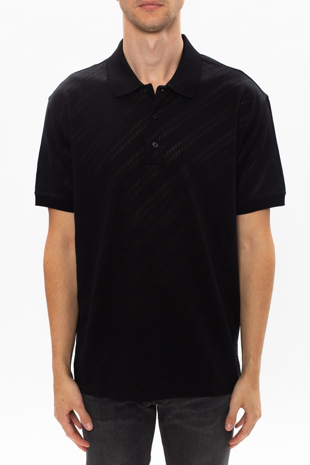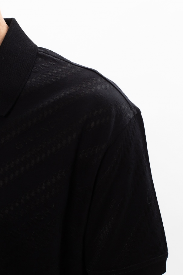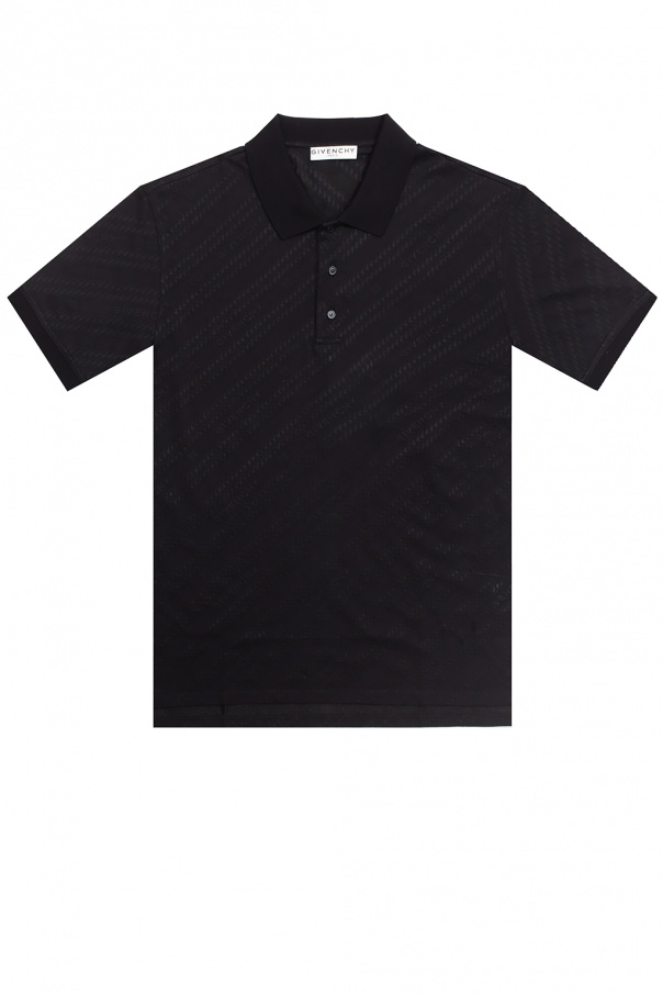 Black polo shirt from Givenchy. Fastened with buttons, short sleeve design comes enriched with an embroidered logo pattern in black and ribbed trims.