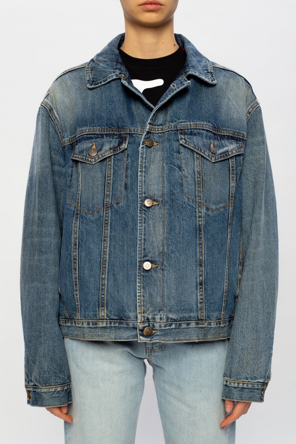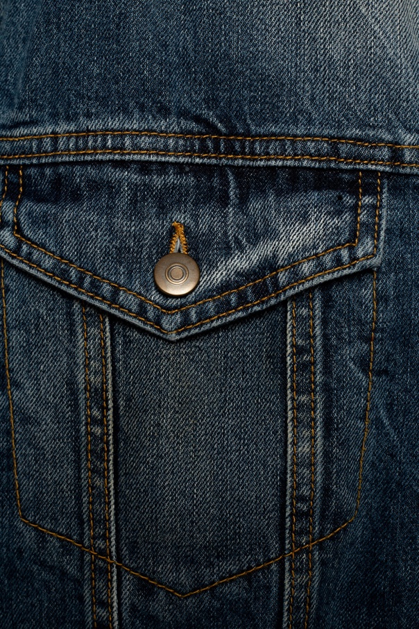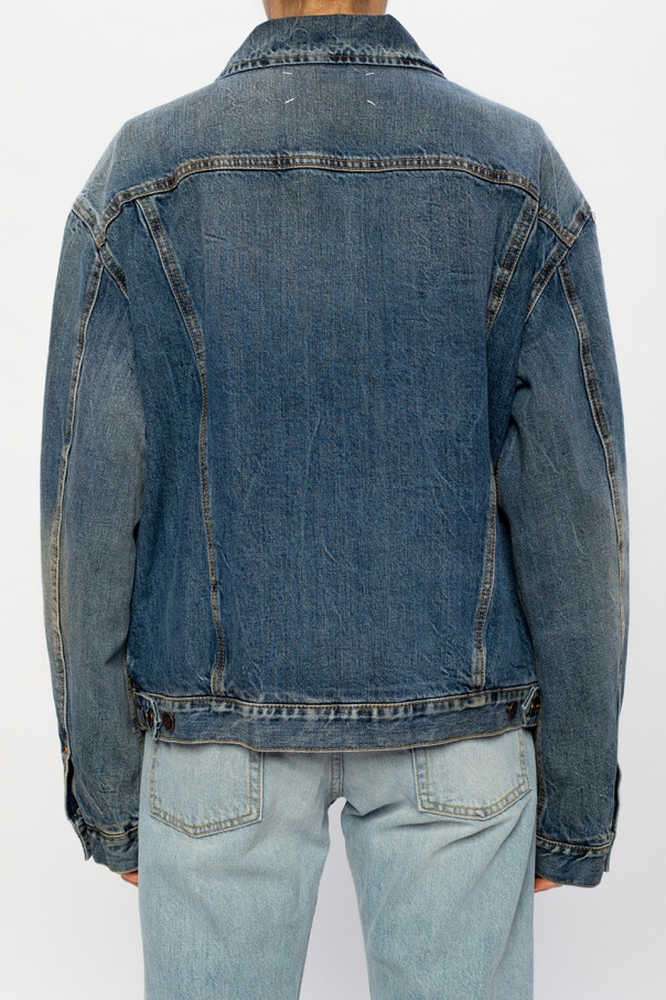 Blue denim jacket from Maison Margiela. Crafted from cotton, this long-sleeved trucker jacket fastens via buttons and employs four pockets on the front, including two flapped ones with button closures, long sleeves and red and black checked lining.