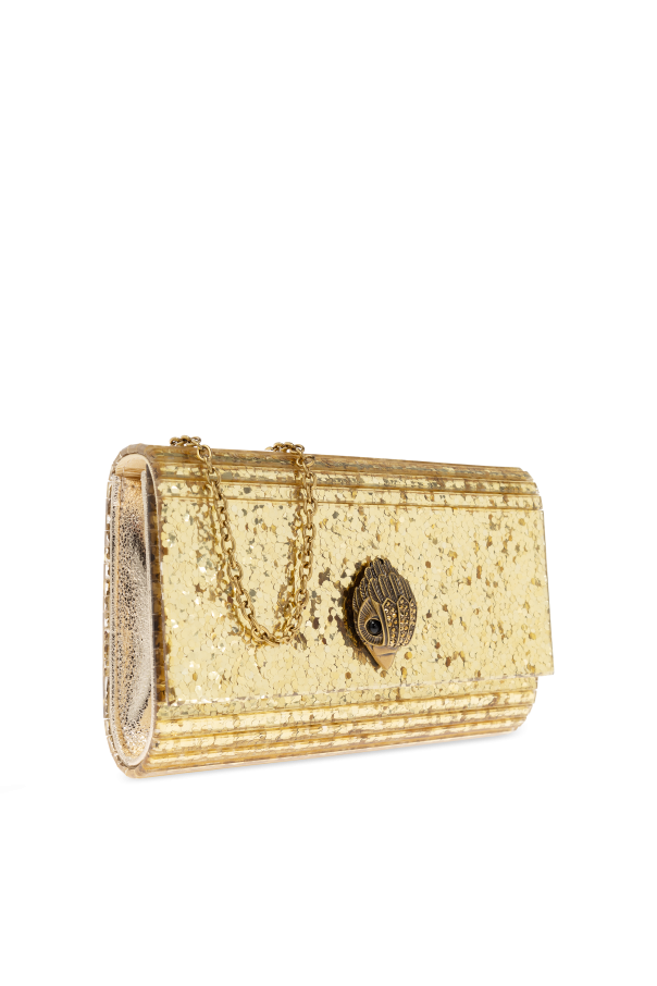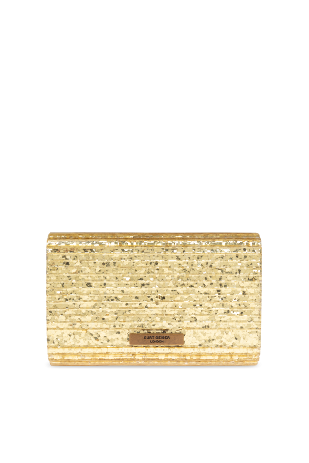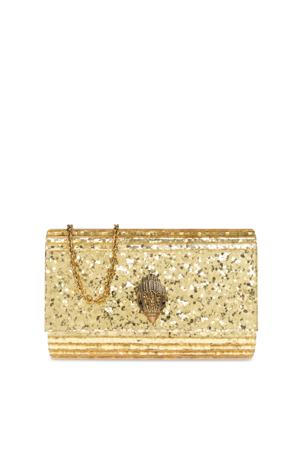 Introducing the exquisite ‘Party Eagle’ Clutch from the renowned designer Kurt Geiger. This rectangular clutch, with its gracefully rounded edges, is a stunning masterpiece adorned with shimmering golden sequins, exuding a luminous and opulent allure. Crafted with an exterior of sequined plastic and an interior lined with soft material, this clutch epitomizes luxury. The pièce de résistance is the ornamental gold clasp, artistically fashioned after an eagle\'s head, adding a bold statement to its design. The clutch\'s golden hue, complemented by a chic gold chain strap, offers versatility—wear it elegantly over the shoulder or carry it as a sophisticated hand accessory. Inside, a discreet slip pocket provides space for your essentials. Why Choose This Product? Luxurious Design: Shimmering sequins and a unique eagle clasp. Versatile Wear: Gold chain strap for shoulder or hand carry. Practical Features: Secure clasp and interior slip pocket.