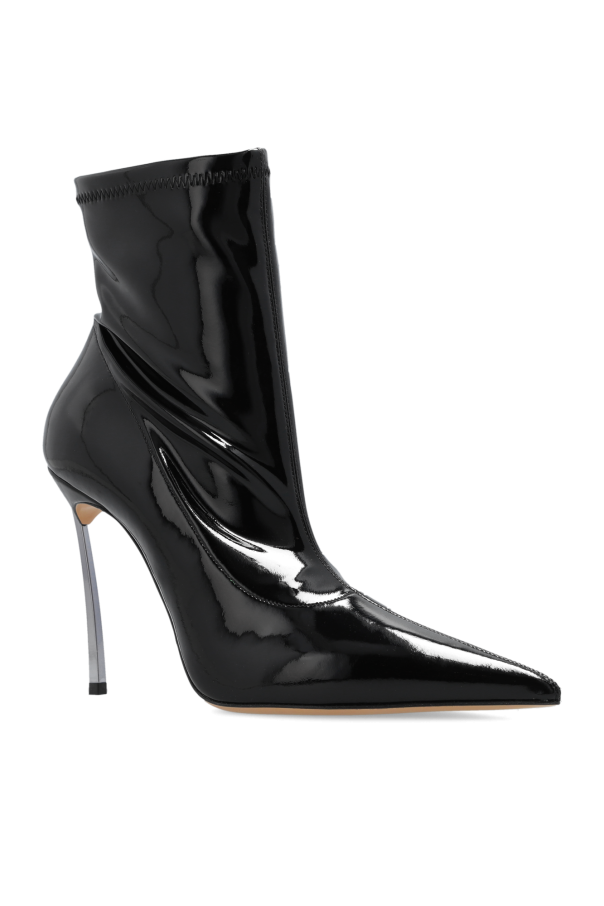 Black ‘Super Blade’ heeled ankle boots Casadei. Ultravox’ heeled ankle boots from Casadei. Made of patent faux leather, this slip-one pair features a pointed toe, silver-tone metal heel and beige leather sole.
