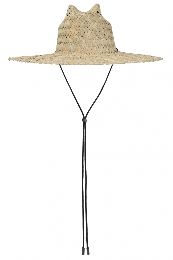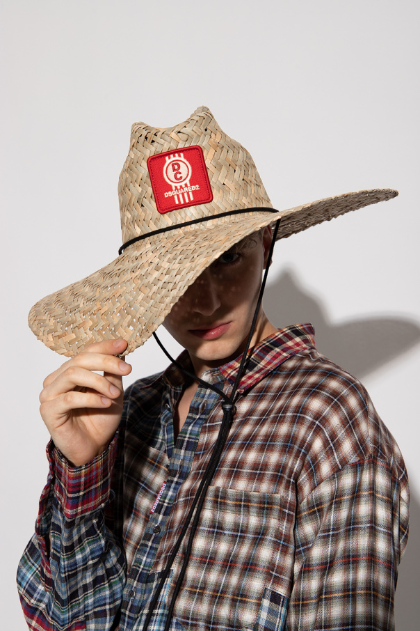 Beige woven straw hat from Dsquared2. Emblazoned with a red and cream logo patch on the front, this item features black drawstring closures.