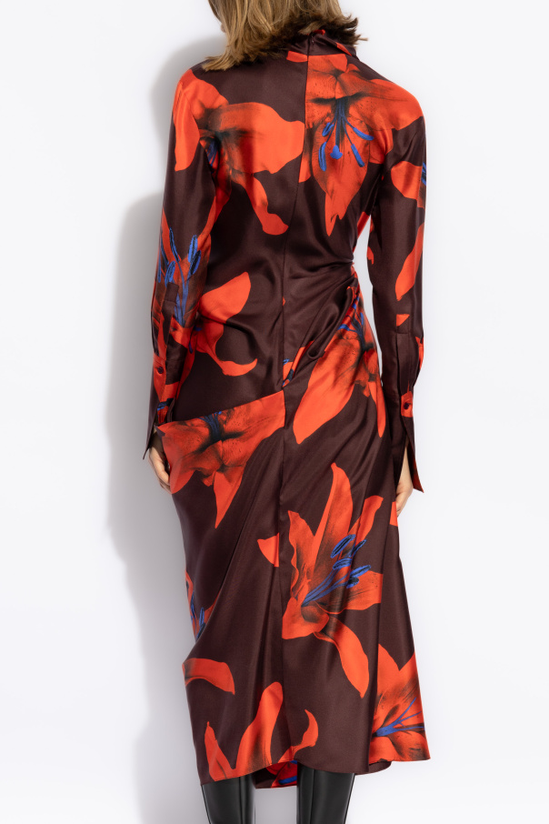 Introducing the Silk Dress from the exclusive collection of Alexander McQueen. This captivating garment, crafted from luxurious silk, embodies the perfect marriage of tradition and innovation. Its burgundy hue is elegantly adorned with a bold, floral pattern in shades of red and blue, offering a stunning visual symphony. The dress features a midi length, long sleeves, and a high collar, exuding sophistication and timeless elegance. A distinctive asymmetrical draping at the waist adds a touch of modernity and dynamism, enhancing its form-fitting silhouette while allowing freedom of movement. The smooth, lustrous fabric accentuates its opulent character. Secured with a discreet back zipper closure, this dress is a testament to McQueen\'s ability to fuse history with art, creating garments that provoke and influence. Why Choose This Product? Exquisite design by renowned fashion house Alexander McQueen. Crafted from pure silk for ultimate luxury and comfort. Unique asymmetrical draping for a contemporary look. Striking floral pattern in rich, elegant colors.
