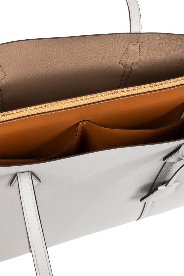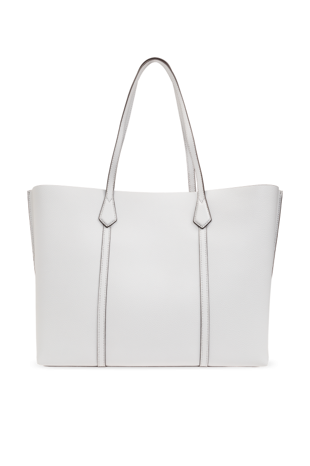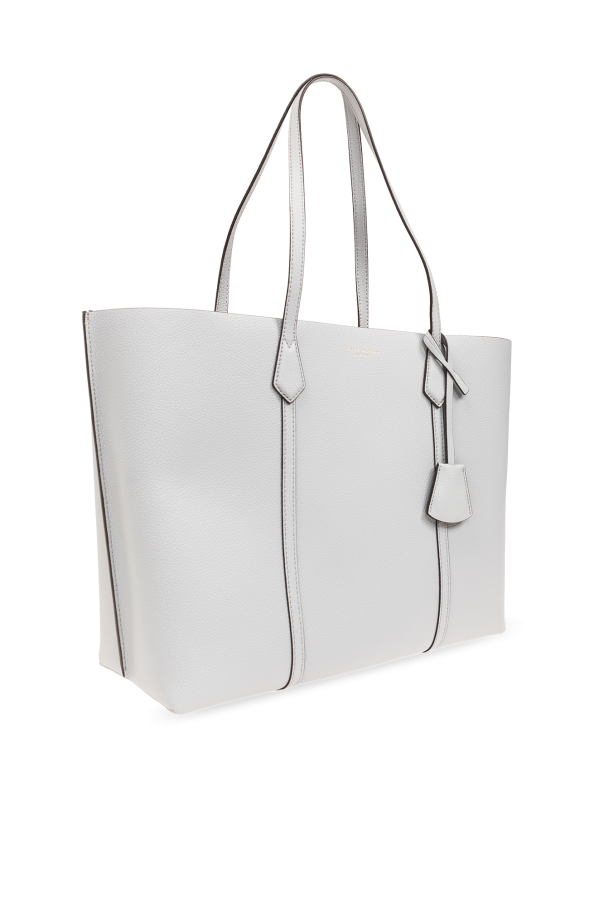 Light grey ‘Perry’ shopper bag from Tory Burch. Made of grained leather, this model features a logo print, detachable logo charm, two handles, gold-tone metal hardware and one internal compartment with a zipped partition and three slip pockets.
