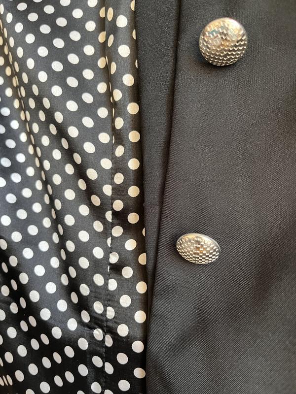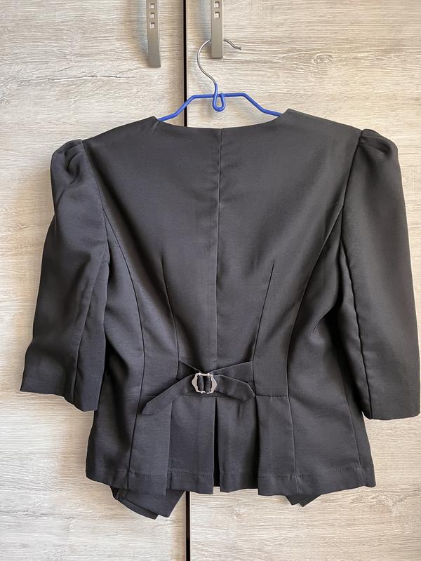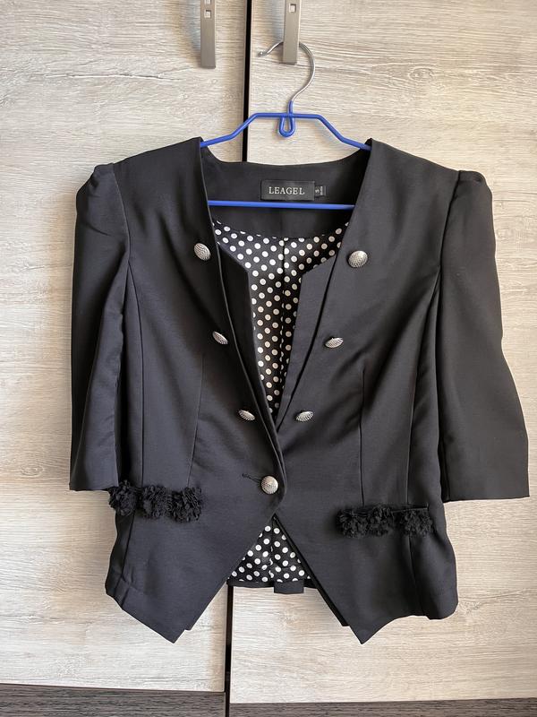 Черный укороченный жакет Leagel с рукавом 3/4 в размере S, в отличном состоянии. Имеет красивый атласный подклад в горошек.