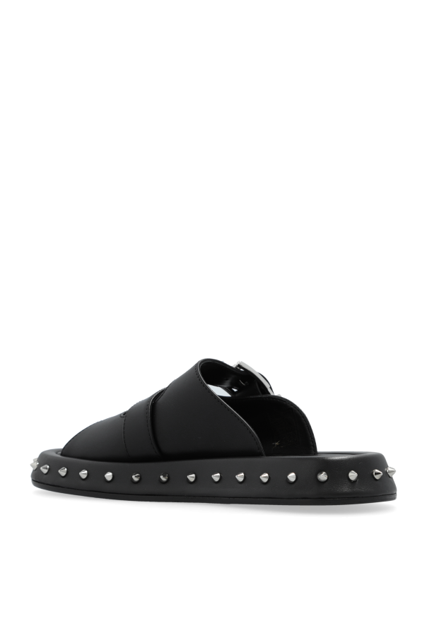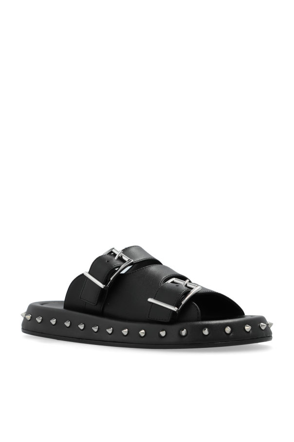 Indulge in the epitome of sophisticated casual wear with the Alexander McQueen Leather Slides from the exclusive collection. These slides feature a classic, streamlined shape with two broad leather straps elegantly crossing over the foot. Crafted from premium black leather, the straps are adorned with substantial metal buckles, allowing for an adjustable fit. Adding a touch of avant-garde flair, metal studs are meticulously placed around the sole, imbuing the slides with a distinctive rock-inspired edge. Inside, the designer’s logo, \"Alexander McQueen,\" is subtly embossed, marking the authenticity and luxury of these slides. The thick sole provides exceptional comfort, ensuring these slides are not only stylish but also practical for all-day wear. Their modern and sophisticated appearance makes them an excellent choice for both casual outings and more polished ensembles. The versatile black color ensures they complement a myriad of wardrobe choices. Why Choose These Slides? Crafted from high-quality black leather for durability and elegance. Adjustable fit with metal buckles on the straps. Enhanced with metal studs for a unique, edgy look. Comfortable thick sole for all-day wear. Versatile design suitable for various styles and occasions.