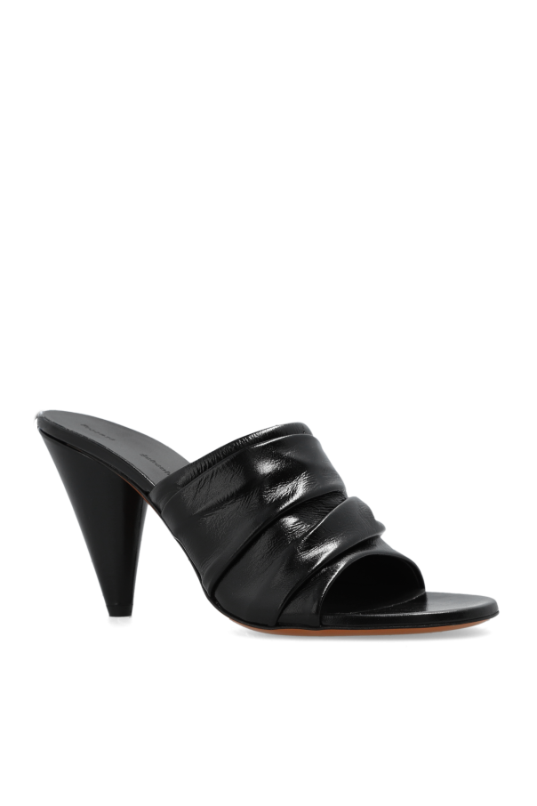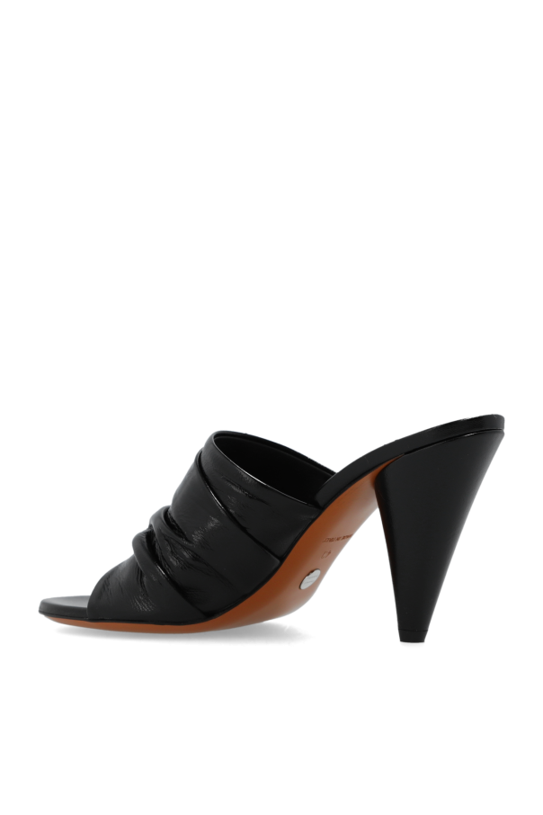 Black ‘Gathered Cone’ mules from Proenza Schouler. Made from patent leather, this model sits on a brown leather sole and features gathered detailing.