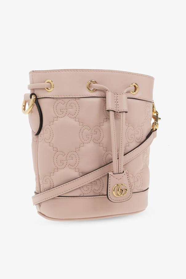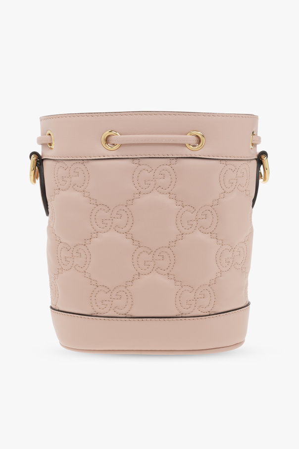 Light pink bucket shoulder bag from Gucci. Crafted from ‘GG Matelasse’ with monogram quilting, this design cinches closed with drawstrings accentuated with ‘Double G’ hardware and features a detachable and adjustable shoulder strap, a beige fabric shoulder strap, gold-tone metal elements and one internal compartment.