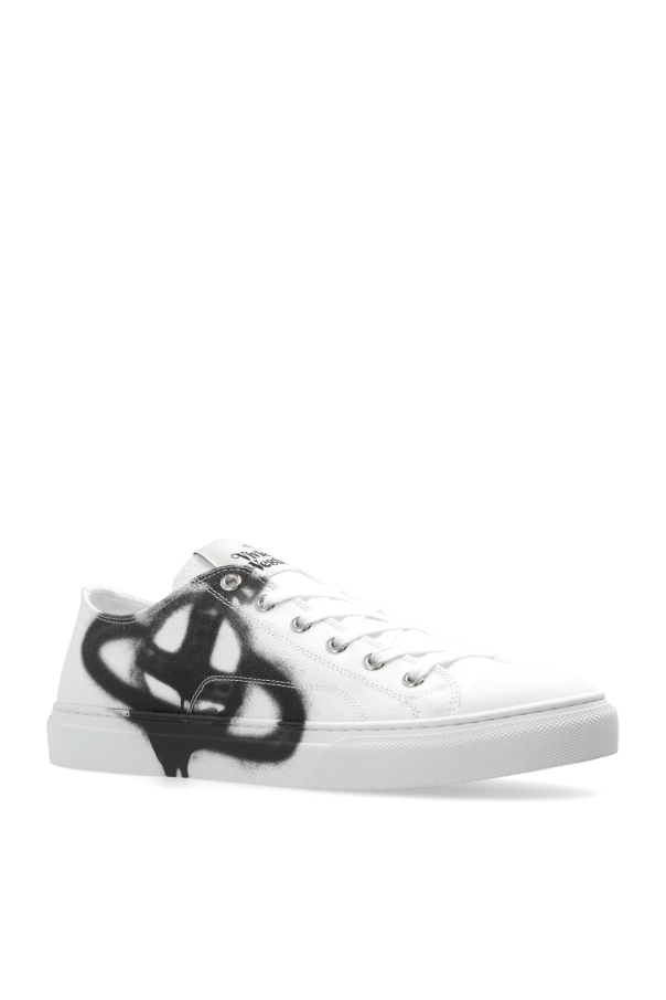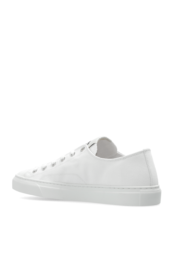 White ‘Plimsoll low top 2.0’ sneakers from Vivienne Westwood. Made of fabric, this lace-up pair features a black logo print and white rubber sole.