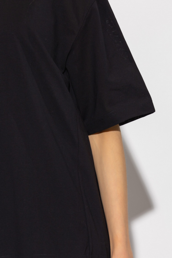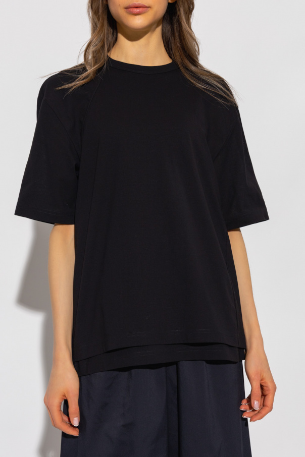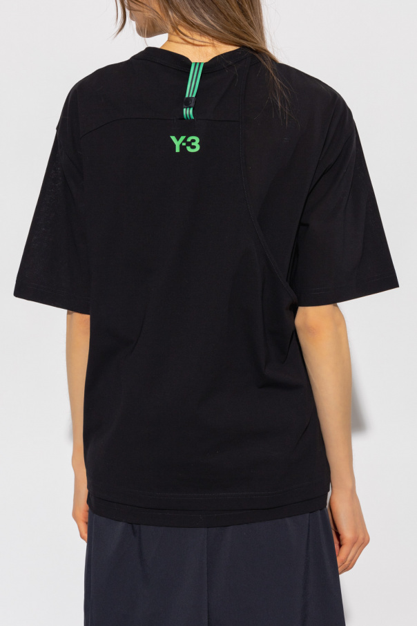 Black two-layer T-shirt from Y-3 Yohji Yamamoto. Crafted from cotton, this style features short sleeves, an elasticated collar and distinctive topstitched detailing.