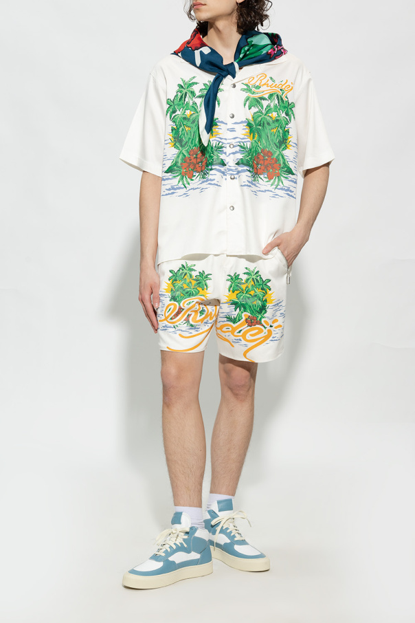 Blue and white high-top sneakers from Rhude. Crafted from leather with distressed detailing, this lace-up model sits on a cream rubber sole and showcases a logo patch on the side and an embossed logo on the front.