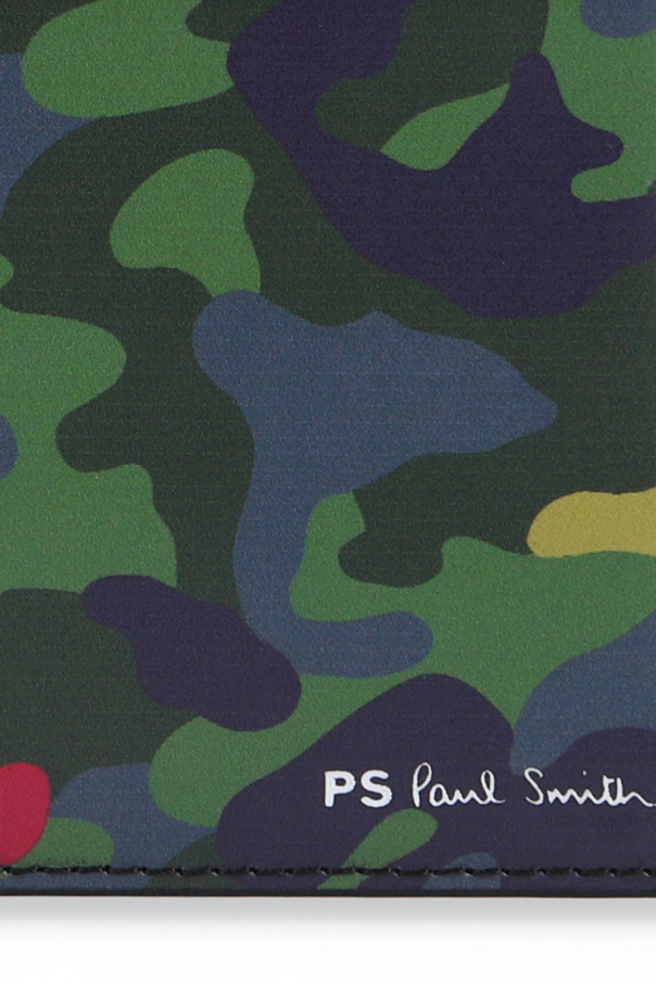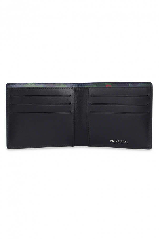 Multicolored bifold wallet from PS Paul Smith. Made of cow leather, this design features a camo pattern and an embossed logo in white. It has black lining, bill compartment, snap-fastened coin pocket, two slip pockets and six card slots inside.