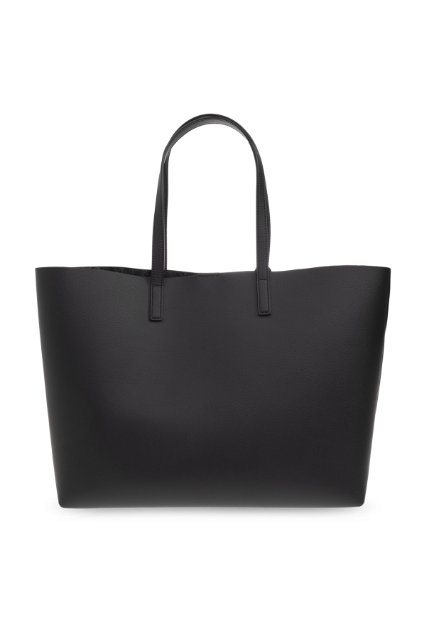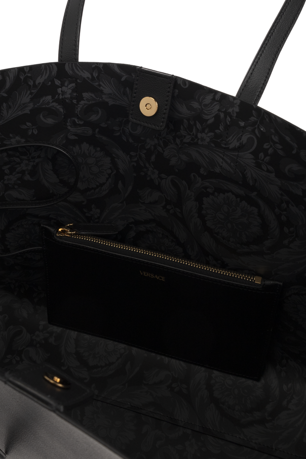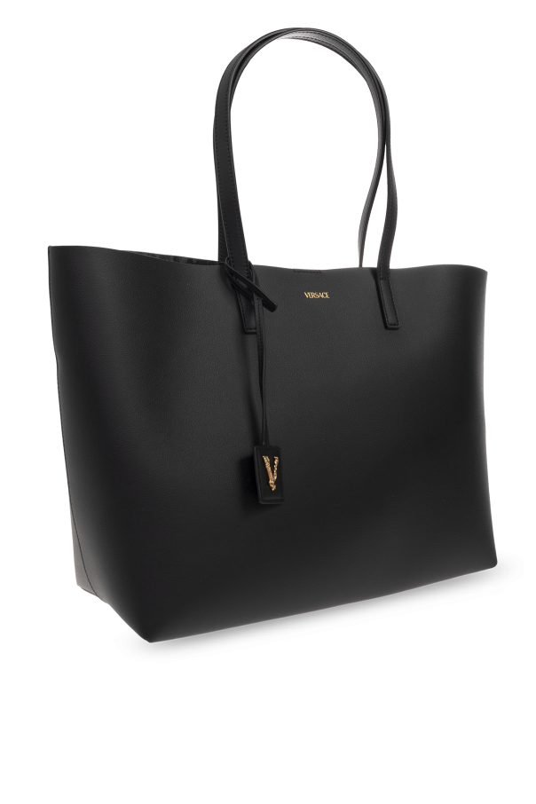 Black ‘Virtus’ shopper bag from Versace. Made of calf leather, this design fastens with a magnetic snap and is decorated with a gold-tone logo print and a metal Barocco V charm. It is complete with two half-round handles, gold-tone metal hardware, grey and black lining with the Barocco motif and one internal compartment with a detachable zipped pouch.