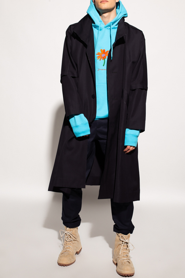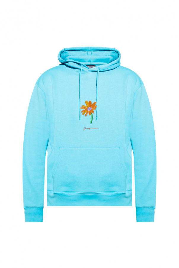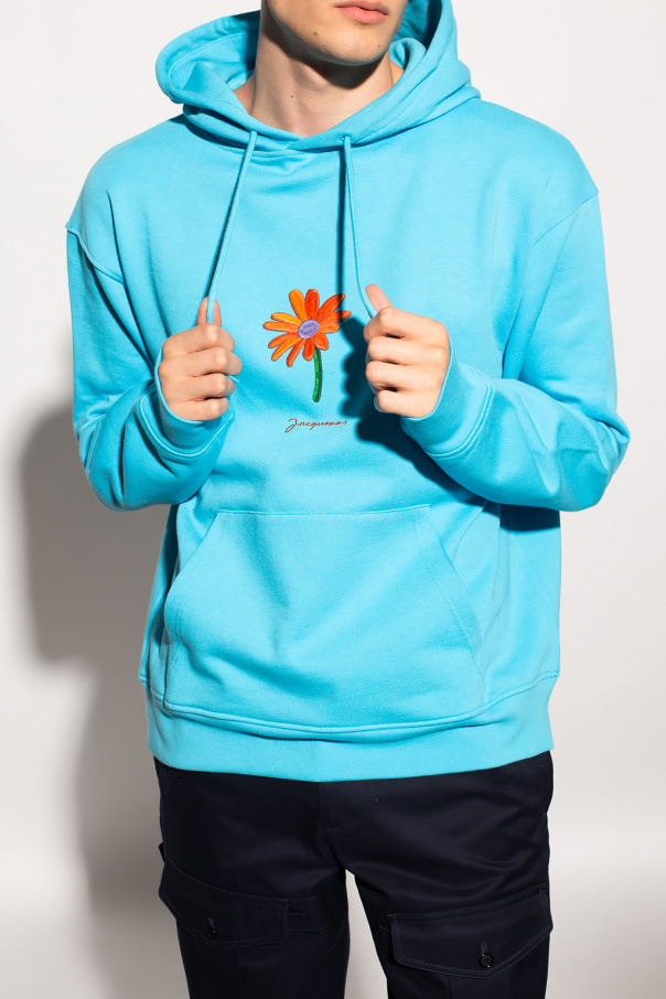 Blue hoodie from Jacquemus. Crafted from cotton, this garment features a drawstring hood, front pocket, multicolored embroidered logo pattern and ribbed trims at the hem and cuffs.