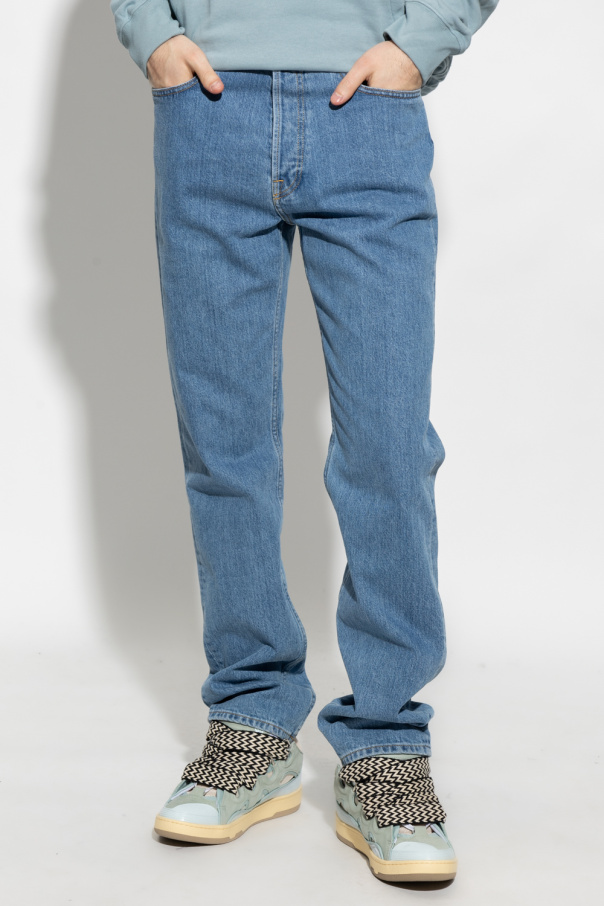 Light blue jeans from Lanvin. Fastened with buttons, this pair falls down with slightly tapered legs and is complete with a logo patch at the back, three front pockets and two back pockets.