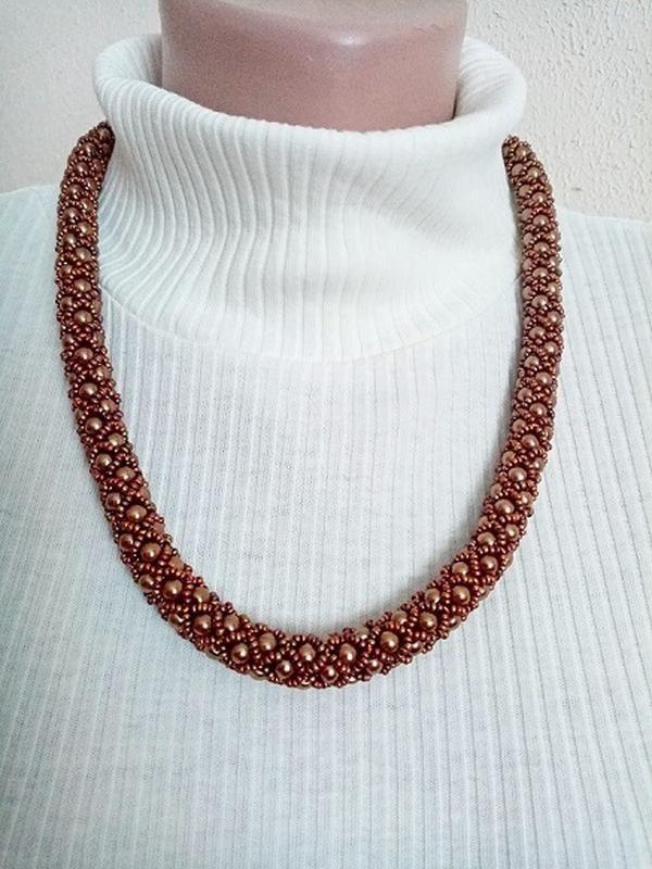 Жгут изготовлен из стеклянных бусин под жемчуг 6мм шоколадного цвета, чешского бисера ирис. Длина 60см