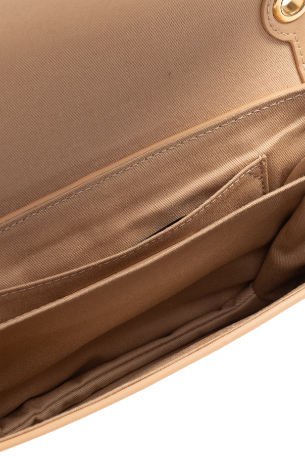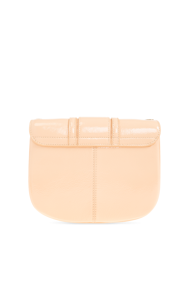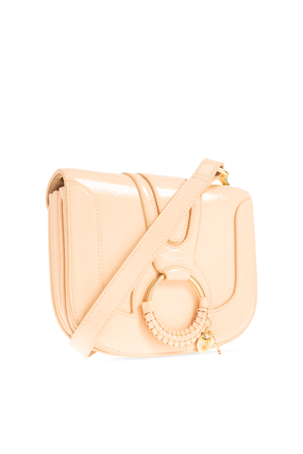 Pink ‘Hana’ shoulder bag from See By Chloe. Crafted from patent leather, this model features a snap closure, decorative round element with woven details and logo charms, detachable and adjustable shoulder strap, gold-tone metal hardware and two separate internal compartments with one card slot.