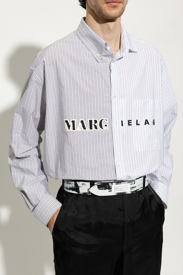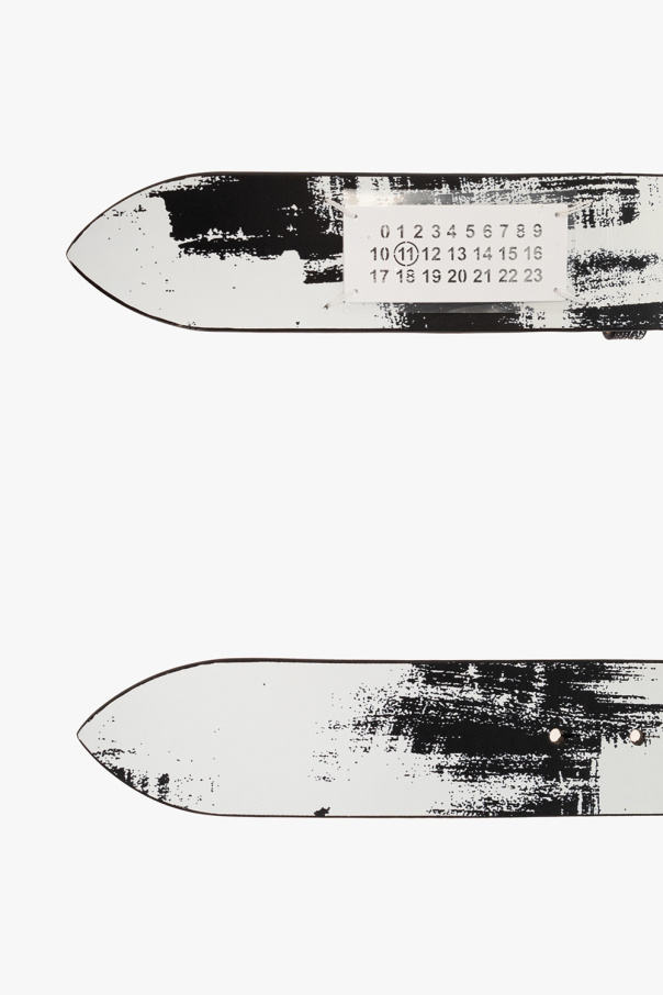 White and black belt from Maison Margiela. Made of leather, this item features a pattern and logo detail.