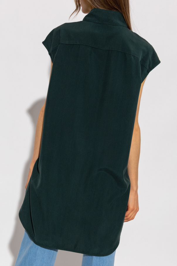 Dark green sleeveless shirt from Lemaire. Made of silk with a relaxed silhouette, this style features a V-neckline with mother-of-pearl buttons and side bottom splits.