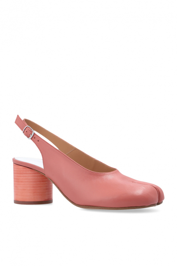 Pink ‘Tabi’ pumps from Maison Margiela. Made of leather, this pair features a decorative cut-out, elastic buckle strap at the back and beige leather sole.