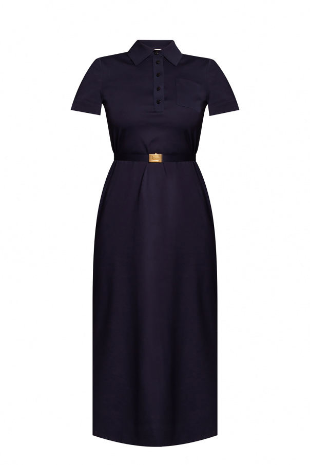 Navy blue dress with a collar from Tory Burch. Made of cotton, this style features button fastenings, short sleeves, a slip pocket on the front, slits on the sides and an included belt with a gold-tone buckle.