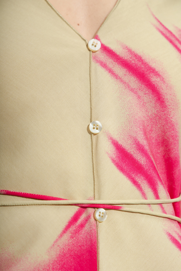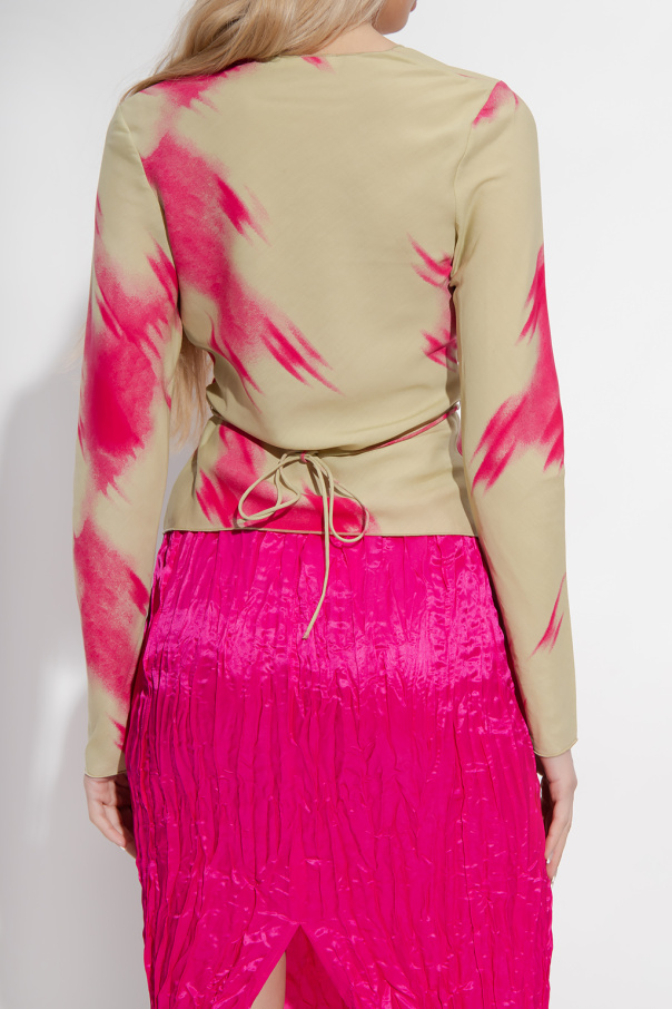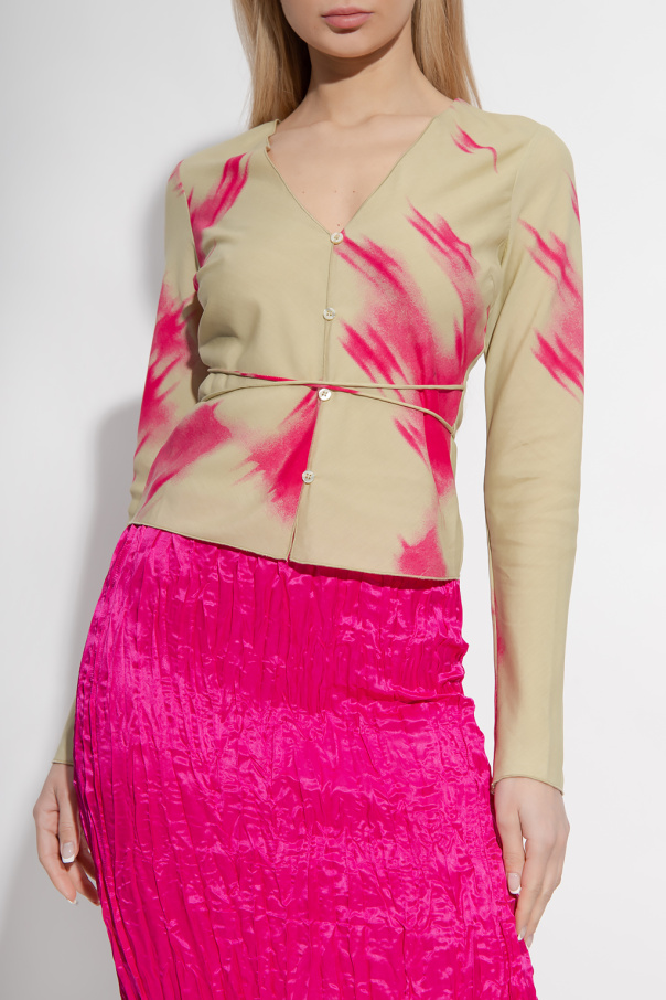 Light green and pink ‘Emmie’ top from Samsoe Samsoe. Cinched at the waist with a drawstring belt, this style features a V-neckline, button fastenings and long sleeves.