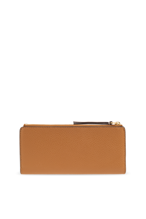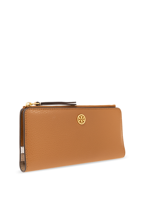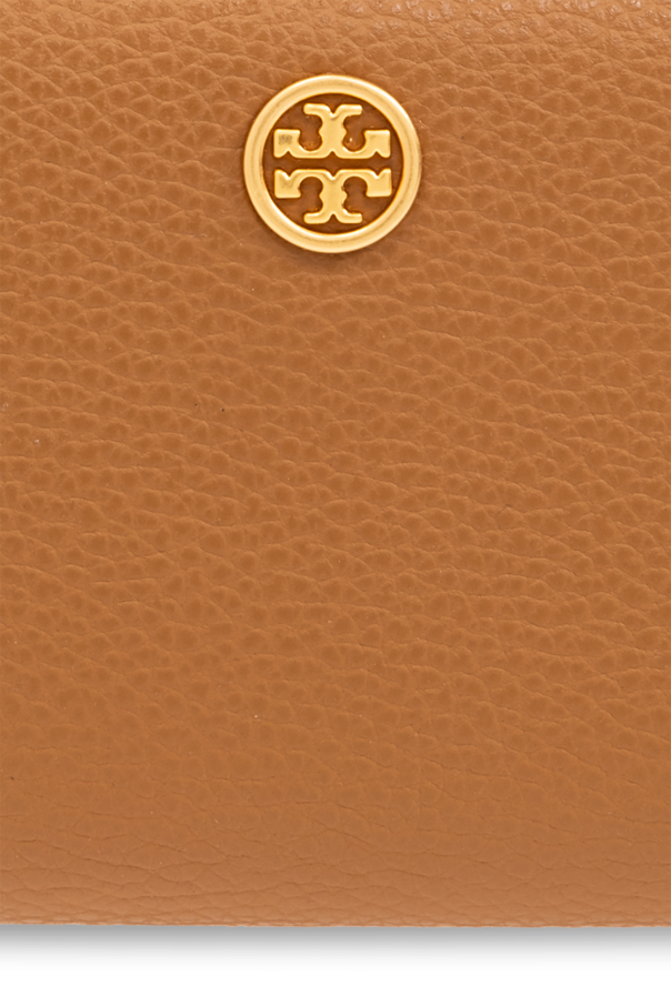 Brown wallet from Tory Burch. Made of grained leather, this item features a snap closure, metal logo detail, zipped back pocket, gold-tone metal hardware and two internal compartments and eight card slots.