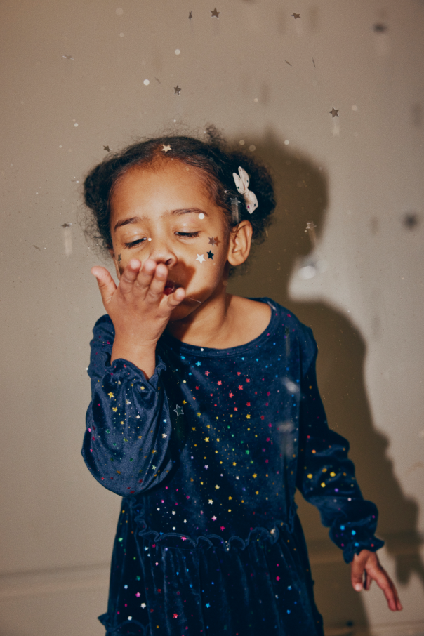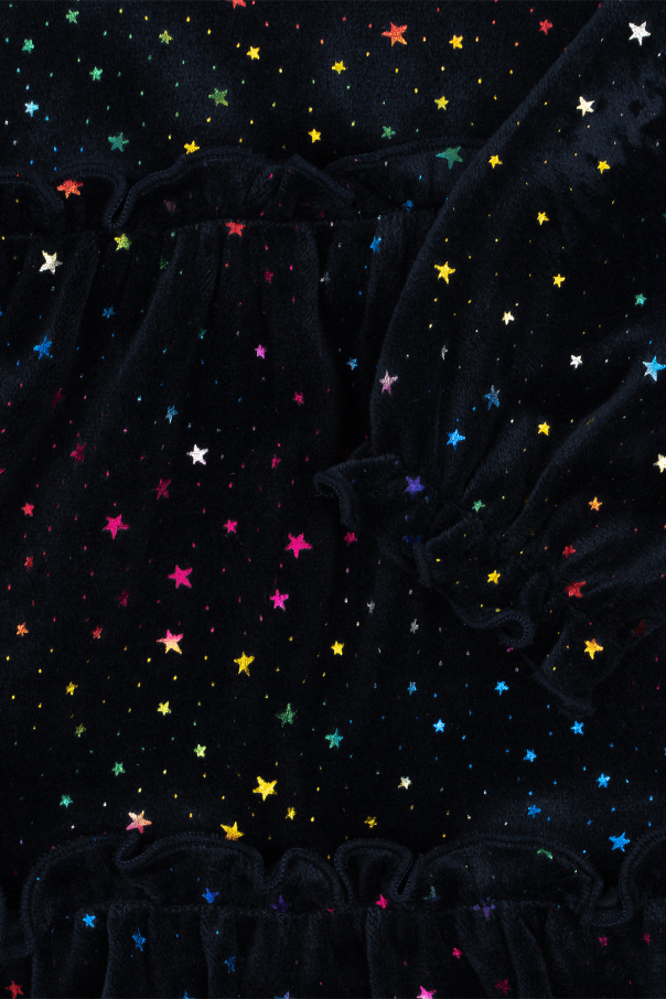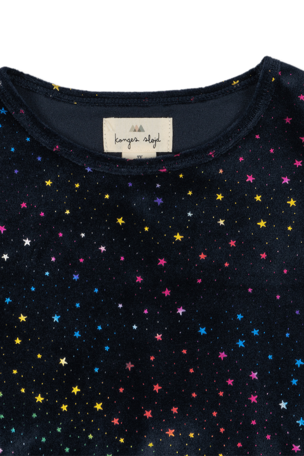 Navy dress from Konges Slojd. Crafted from recycled fabric with a velvet finish, this flared design features a multicolored star pattern and long sleeves.