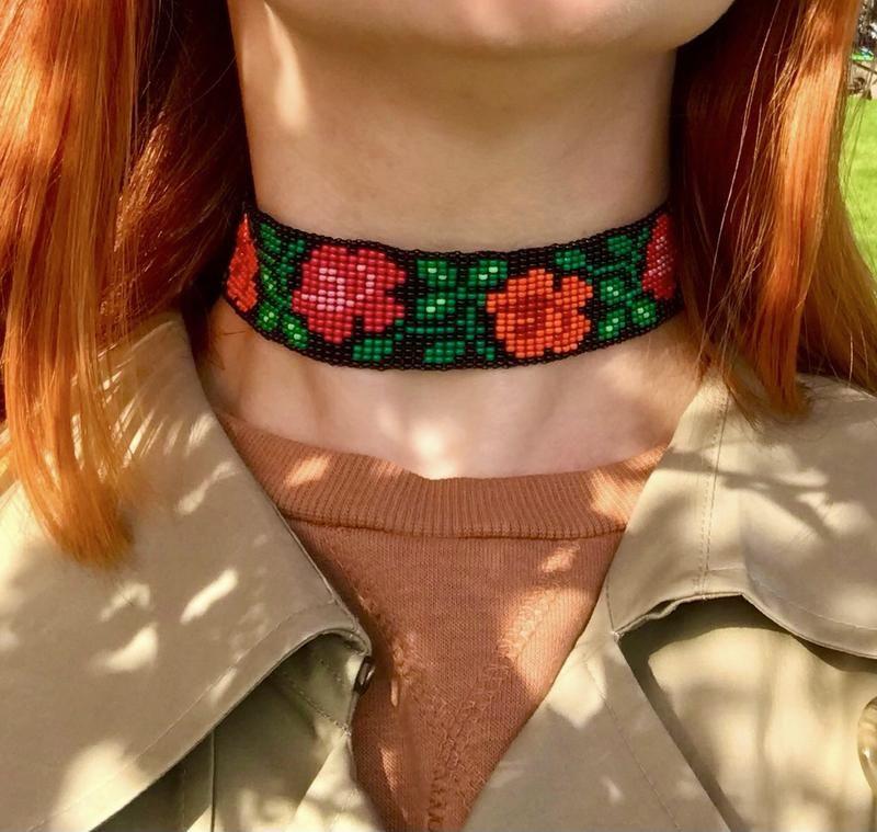 Гердан з малиновими та жовтогарячими трояндами, натхненний візерунками старовинних вовняних килимів. Схема авторська.