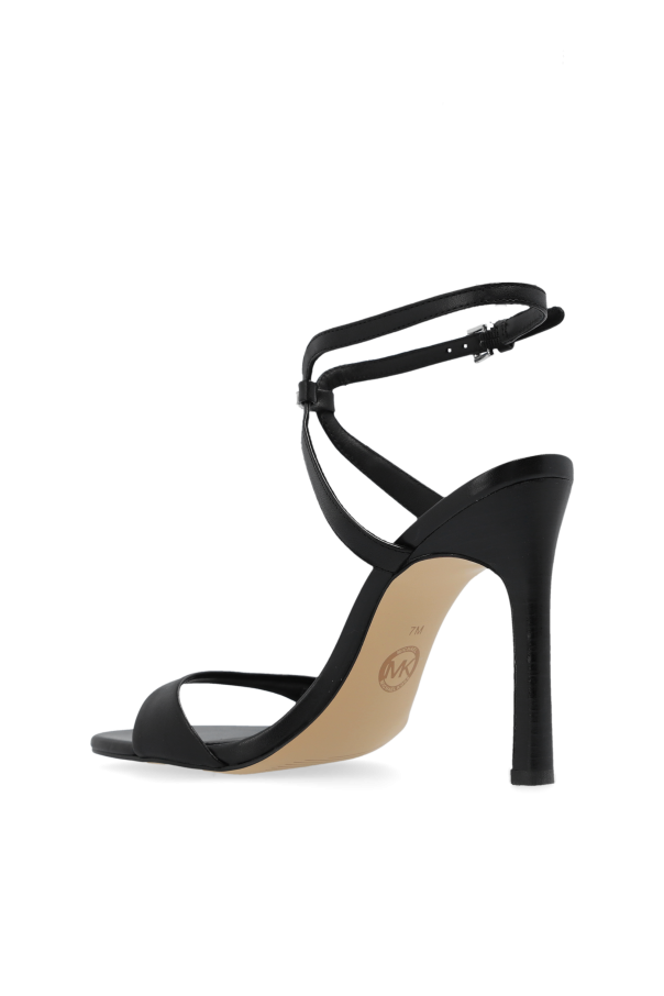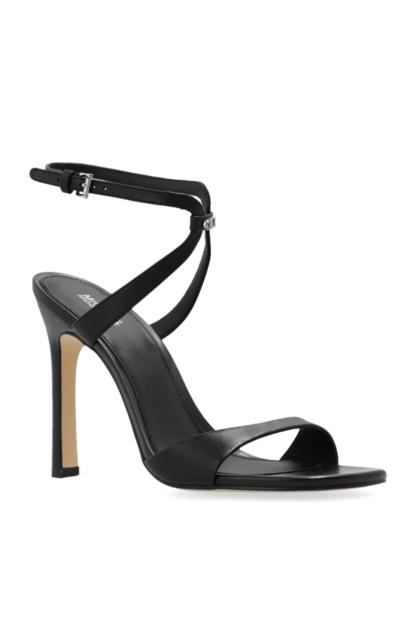 Introducing the \'Amara\' Heeled Sandals by the acclaimed designer Michael Michael Kors. These sandals epitomize the fusion of elegance and minimalism, designed for the discerning woman who appreciates refined style and unparalleled quality. Crafted from the finest leather, both on the exterior and interior, these sandals offer a sleek, smooth texture that pleases the senses. The \'Amara\' features a unique design with a single wide strap across the front and a delicate T-shaped strap that traverses the midfoot, culminating in an adjustable ankle strap with a buckle closure. The slender column heel adds a touch of sophistication, while the contrasting beige rubber sole provides a subtle yet striking visual contrast, enhancing the shoe\'s overall allure. With the designer\'s logo subtly placed on the inner side of the ankle strap, these sandals carry the mark of luxury and exclusivity. Whether part of an exclusive clothing collection or as a standalone statement piece, the \'Amara\' sandals are sure to elevate any ensemble with their refined aesthetics. Why Purchase the \'Amara\' Heeled Sandals? Elegant Minimalism: Sleek, simple design that exudes sophistication. Premium Leather: High-quality material for durability and comfort. Designer Craftsmanship: The assurance of Michael Michael Kors\' renowned design and quality. Versatile Style: Perfect for both formal and casual occasions. Unique Features: The tasteful combination of the T-shaped strap and slender heel creates a distinctive, chic look.
