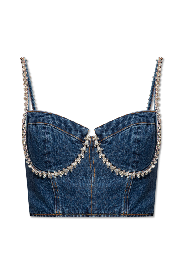 Blue denim tank top from Self Portrait. Spruced up with glossy crystals, this style features a cropped fit and back zipper.