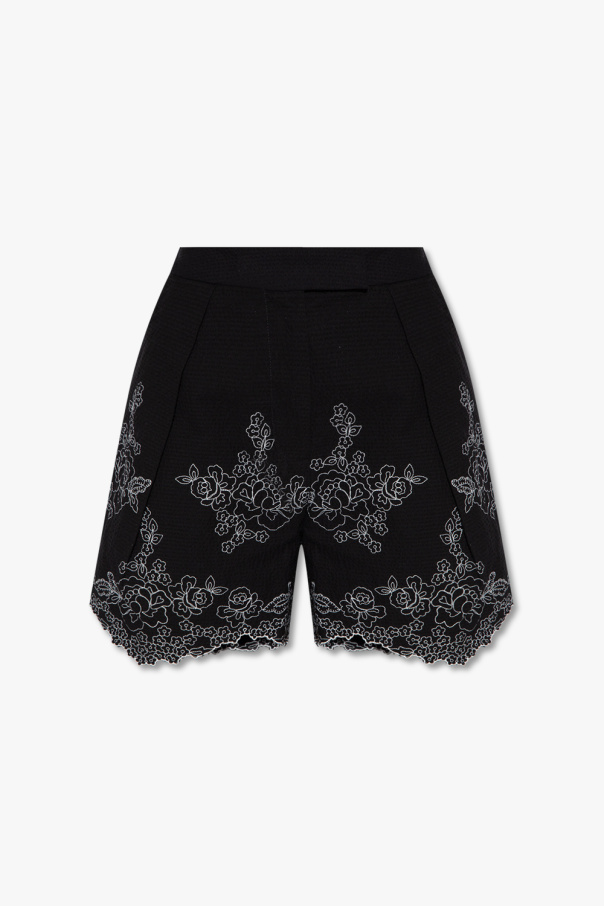 Black ‘Violeta’ shorts from Erdem. Crafted from seersucker cotton with white floral embroidery, this pair features a high-rise waist, a zip fly with a button and hook, two front slip pockets, two back button pockets and decorative scalloped hems.