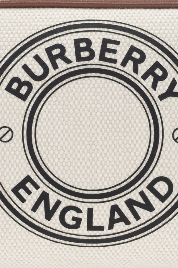 White and brown wash bag from Burberry. Size small. Made of canvas, this design fastens via a zip and showcases a black logo print, white stitching details, calf leather trims, gold-tone metal hardware and one internal compartment.