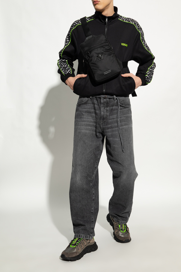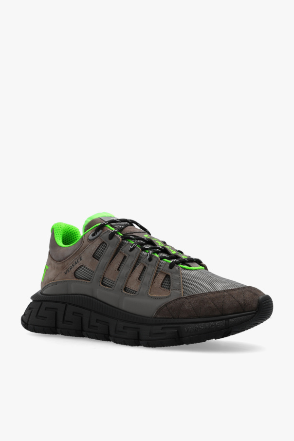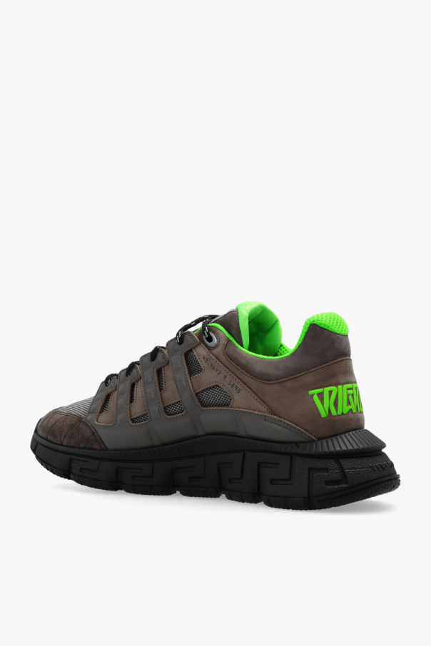 Brown, black and green ‘Trigreca’ sneakers from Versace. Made of calf leather, this model features fabric trims with printed Milan’s coordinates, logo detail, the brand’s signature Greca pattern and rubber sole in black and pink.